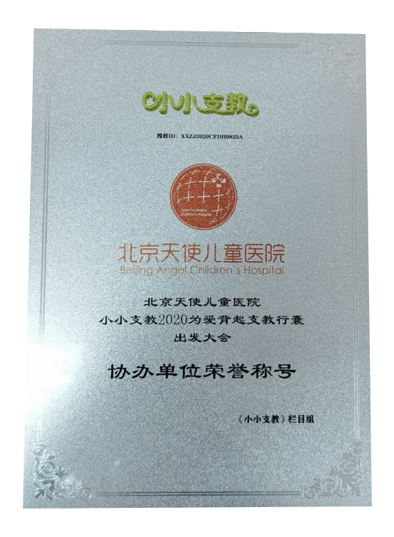 北京天使儿童医院多次与小小支教栏目组合作,参加多次公益义诊活动,并提供物质援助及医疗帮扶,荣获小小支教栏目组“协办单位荣誉称号”,北京天使儿童医院会一如既往坚持以公益为本,担当社会责任,护卫儿童身心健康,让更多的孩子能够在活动中受益。