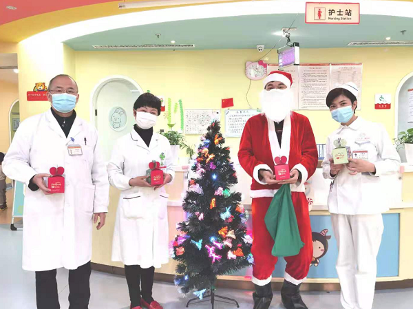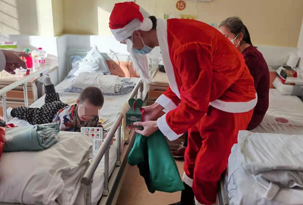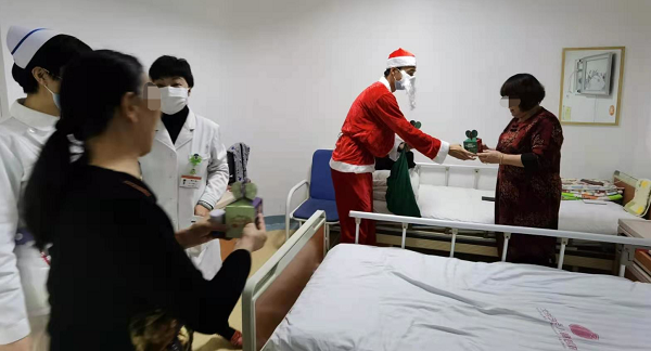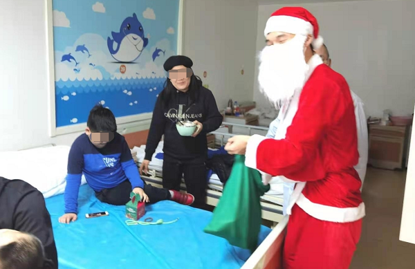 12月24日是平安夜(即圣诞前夕),大街小巷上早已弥漫着圣诞的气息,为了让患儿和家属感受到节日的气氛,缓解疾病带来的折磨,北京天使儿童医院特别策划,提前为患儿准备了精心包装好的平安果,由“圣诞老人”亲自送到每个患儿和家属的手上。