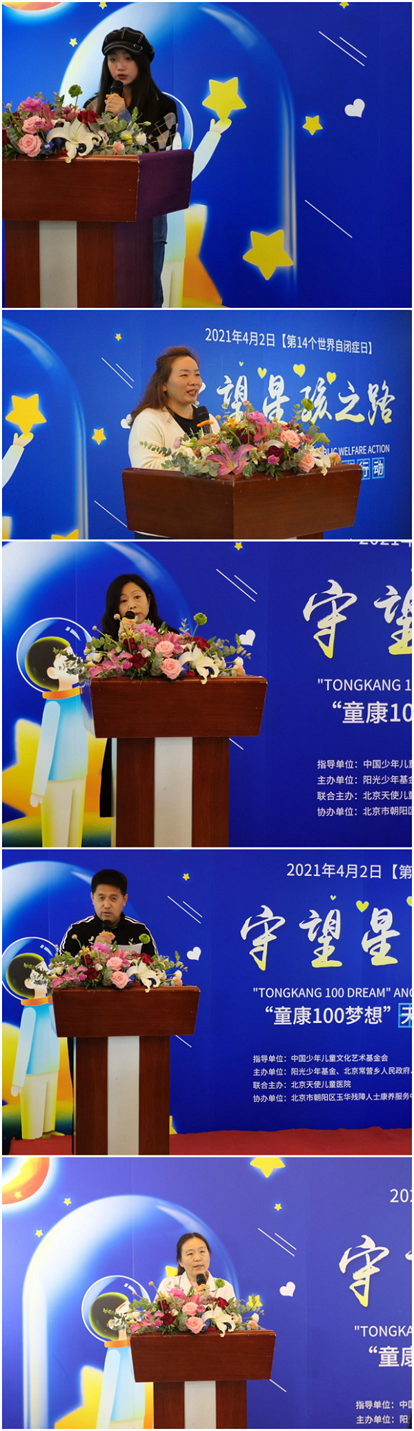 随后,小童星高凤遥、玉华康养中心代表高睿融、心理专家陈蕊、益家公益志愿者协会代表崔巍巍、自闭症专家贾君朴(图片顺序依次)分别发表了讲话,值得关注的是北京天使儿童医院特聘专家贾军朴主任在讲话中提到:在中国,自闭症人士可能超过1000万,其中,0-14岁的儿童可能超过200万。自闭症的患病人数逐渐增长。与增长率相比,自闭症的率却非常低,并不是相关的医学技术不够或专家的缺乏,而是大多家长对自闭症的相关了解不够深刻,所以很多家长在给自闭症儿童训练的过程中一直存在诸多误解!希望随着自闭症知识越来越多的普及,家长可以用客观的眼光来看待自闭症并选择适合自己孩子的治疗方法。
