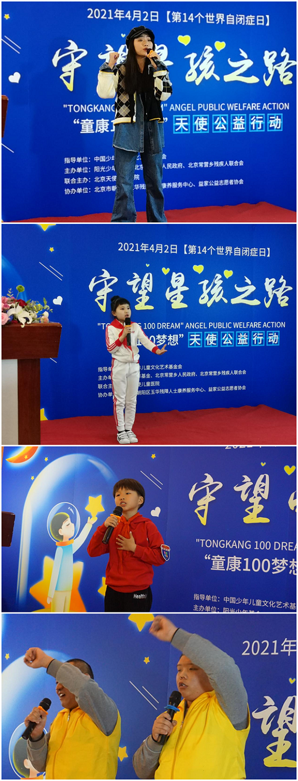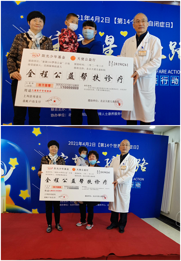 为提高人们对自闭症的意识,争取早期治疗改善患者的状况,在4月2日自闭症日来临之际,北京天使儿童医院联合阳光少年基金会举办“童康100梦想”守望星孩之路公益行动,让“星星的孩子”能够得到更多的帮助,从而能够融入到社会。