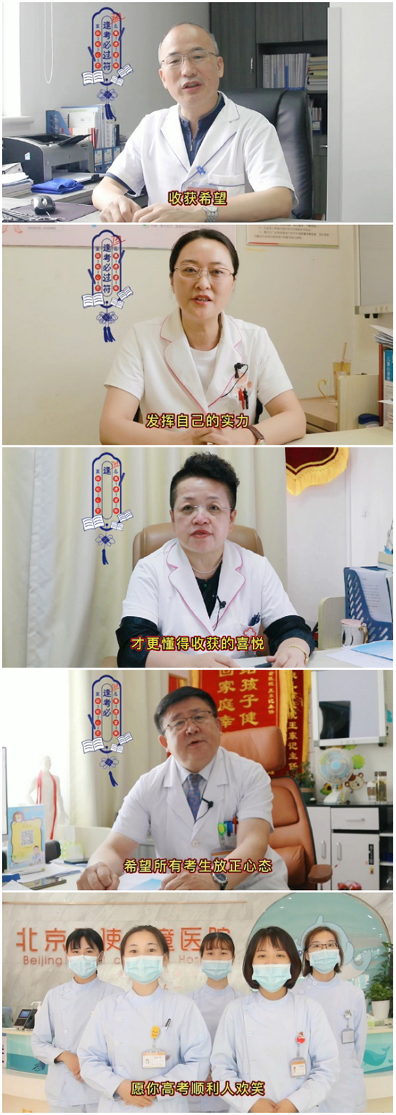 又是一年高考时,寒窗苦读的莘莘学子们在此时迎来了人生中最重要的战役,孩子们怀揣着各自的理想奔赴高考的“战场”,与此同时,北京天使儿童医院的医护人员正坚守在工作岗位上为患儿服务,工作之余,各个科室的专家和护士们给广大考生送上了殷殷的嘱托和真挚的祝福。