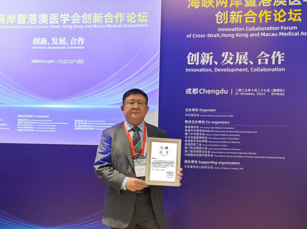 2023年10月29日,由中华医学会、中华医学会儿科学分会主办,四川省医学会承办的中华医学会第二十八次全国儿科学术大会在成都天府国际会议中心圆满落幕。北京天使儿童医院王东记主任在海峡两岸暨港澳医学会创新合作论坛会场中,荣获“海峡两岸医学会儿科医学论文一等奖”。